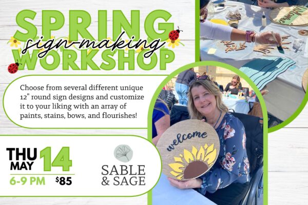 We’re so excited to welcome back the talented team from Sable + Sage Co. for a Spring Sign-Making Workshop on Thursday, May 14th from 6–9 PM.